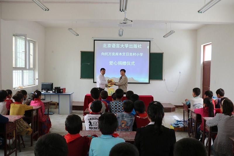 北语社基于在语言教育方面的资源优势与长期联系新疆地区少数民族师生的有利条件,通过捐资助学、对口帮扶、策划专题出版物、语言培训等多种形式支援边疆少数民族地区的文化建设,着力体现出版社与全体党员的社会责任感。2018年,党总支开展了“传递爱心,书送希望”的捐赠倡议,向北京市援疆对口地区——和田库木巴格村捐赠图书1435册和200套文具用品,与驻村工作队共建了村委会图书室。