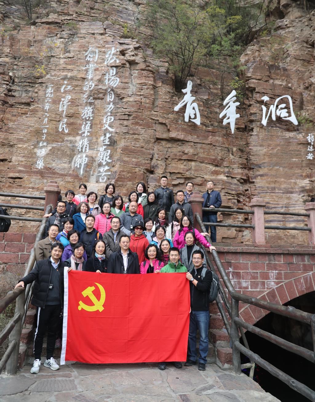 11月2日,老师们首先来到红旗渠的咽喉工程——青年洞。踏上气势恢弘的红飘带廊桥,行走在不足两米宽的渠墙上,身旁就是陡立的峭壁,脚下便是数丈高的悬崖,大家踏上298层石阶,沿着主干渠一路向上,沿途经过创业洞、团结洞、鹰嘴山、一线天、虎口牙,步行超过3公里最终达到了青年洞。在青年洞前,老师们面向党旗、举起右手、重温入党誓词,铮铮誓词,字字千钧,点燃了老师们心中的激情之火、忠诚之火,让人时刻铭记共产党人的庄严承诺和立德树人的神圣职责。晚上,大家观看了大型原创音乐舞蹈史诗《走近红旗渠》,演员们全情投入、忘我表演,通过太行悲歌、太行壮歌、太行欢歌三个篇章的演绎,让大家仿佛回到了当年铁锤叮当、钢钎铿锵、绝壁穿石、挖渠千里的现场,重温了林州人民靠一锤一铲、苦战十年、创造人间奇迹的光辉历史,深切体会到红旗渠这一伟大历史工程的背后,蕴藏了无数可歌可泣、震撼人心的悲壮故事。第二天上午,老师们前往红旗渠纪念馆参观学习,通过观看纪念馆内的实景模型、修渠旧物、影像资料、文字照片等珍贵历史资料,老师们更加深刻地体会到修渠过程的曲折艰辛和红旗渠精神的丰富内涵,对于林县干部百姓构思未来的智慧和胆识、实现梦想的勇气和担当、脚踏实地的干劲和力量感到无比钦佩和敬仰。