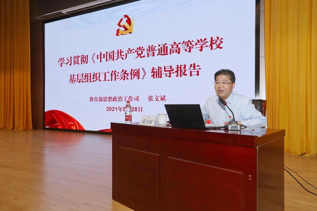 张文斌副司长详细介绍了《中国共产党普通高等学校基层组织工作条例》(以下简称《条例》)修订的背景过程和总体考虑,系统分析了《条例》的框架结构和章节布局,着重解读了《条例》调整完善的重点内容,深入厘清了《条例》对责任落实作出的制度安排,在此基础上对高校学习宣传贯彻《条例》提出了明确要求。他指出,《条例》是新时代坚持和加强党对高校全面领导的一项标志性举措,是百年来高校党的建设工作的一次里程碑事件,为高校各级党组织以及全体党员干部师生践行“两个维护”、坚守初心使命提供了制度化保证,要“在学深悟透上下功夫、在融会贯通上下功夫、在改革攻坚上下功夫、在明责担责上下功夫”。与会同志纷纷表示,张司长的报告政治站位高、理论功底深、联系实际紧,信息丰富、解读权威、深入浅出,既是一次精准的辅导,又是一堂生动的党课。