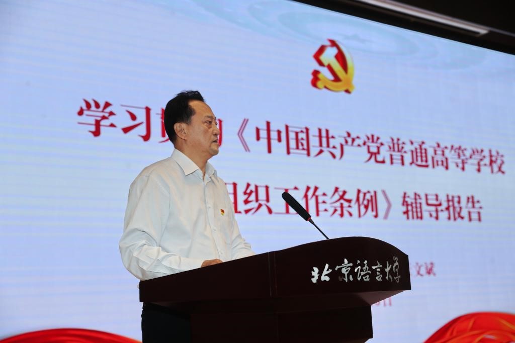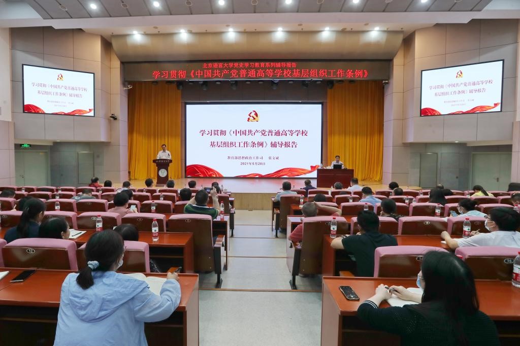 5月28日下午,北语举办党史学习教育系列辅导报告会,邀请教育部思想政治工作司副司长张文斌作了题为“学习贯彻《中国共产党普通高等学校基层组织工作条例》”的专题报告。学校领导班子成员、学校党委委员、纪委委员、全体中层干部、师生党支部书记、专职组织员、党务工作人员和部分骨干教师党员培训班学员等约200人参会。教育部党史学习教育高校第三巡回指导组方国良副组长、范迅副组长、党宁同志出席报告会。报告会由党委书记倪海东同志主持。
