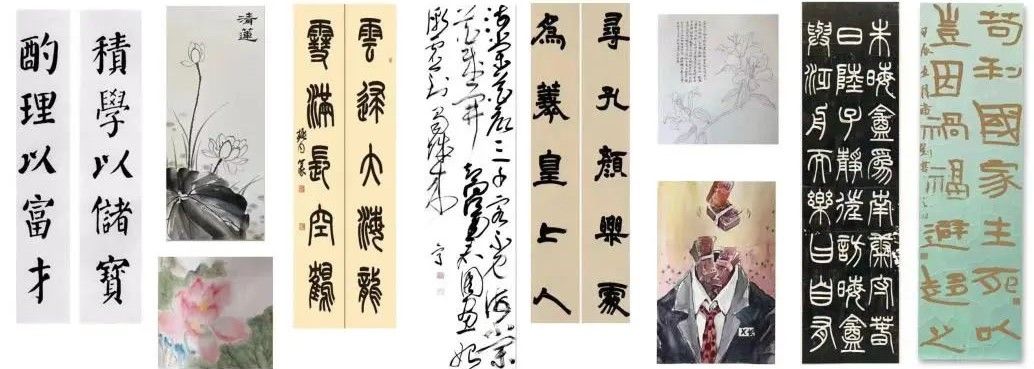同学们为领导和老师们从文化寓意和技法层面介绍每件作品的创作体会,师生们围绕作品开展鉴赏活动。在欣赏过程中,罗建晖副书记充分肯定了艺术学院同学们的精湛艺术技法与深刻文化思考,鼓励同学们肩负起弘扬中华优秀传统文化的重担,通过笔墨丹青将更多的文化内涵表现出来,让更多的人在欣赏艺术作品的过程中体悟背后的内涵语言以及家国情怀。艺术学院党总支陈霞书记介绍说,本学期,全校师生党员在学校党委领导下,将开展党规党纪的学习和党风廉政教育作为重要的政治任务,本次书画展活动由作为支部共建单位的图书馆直属支部和艺术学院党总支联合发起,双方很快达成了合作共识并付诸行动,充分发挥艺术学院学生的专业特长,用笔墨丹青、水彩国画精心创作,将书画艺术与党纪学习教育巧妙融合,弘扬廉洁文化,传递时代精神。她鼓励同学们今后积极参加此类活动,不断丰富自己的文化内涵,提升自己的综合能力。