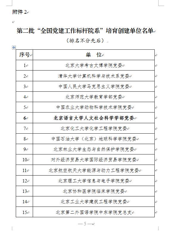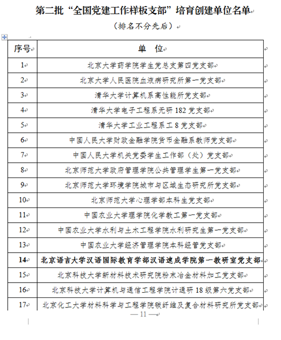 近日,教育部公布了第二批新时代高校党建示范创建和质量创优工作评选结果。我校人文社会科学学部党委成功入选“全国党建工作标杆院系”培育创建单位,汉语国际教育学部汉语速成学院党支第一教研室党支部(现汉语国际教育学部进修系党支部)成功入选“全国党建工作样板支部”培育创建单位。