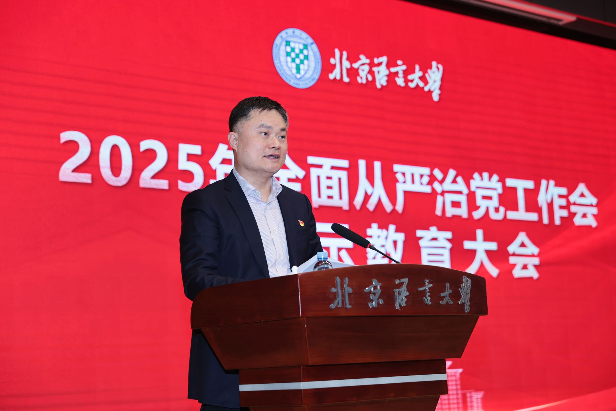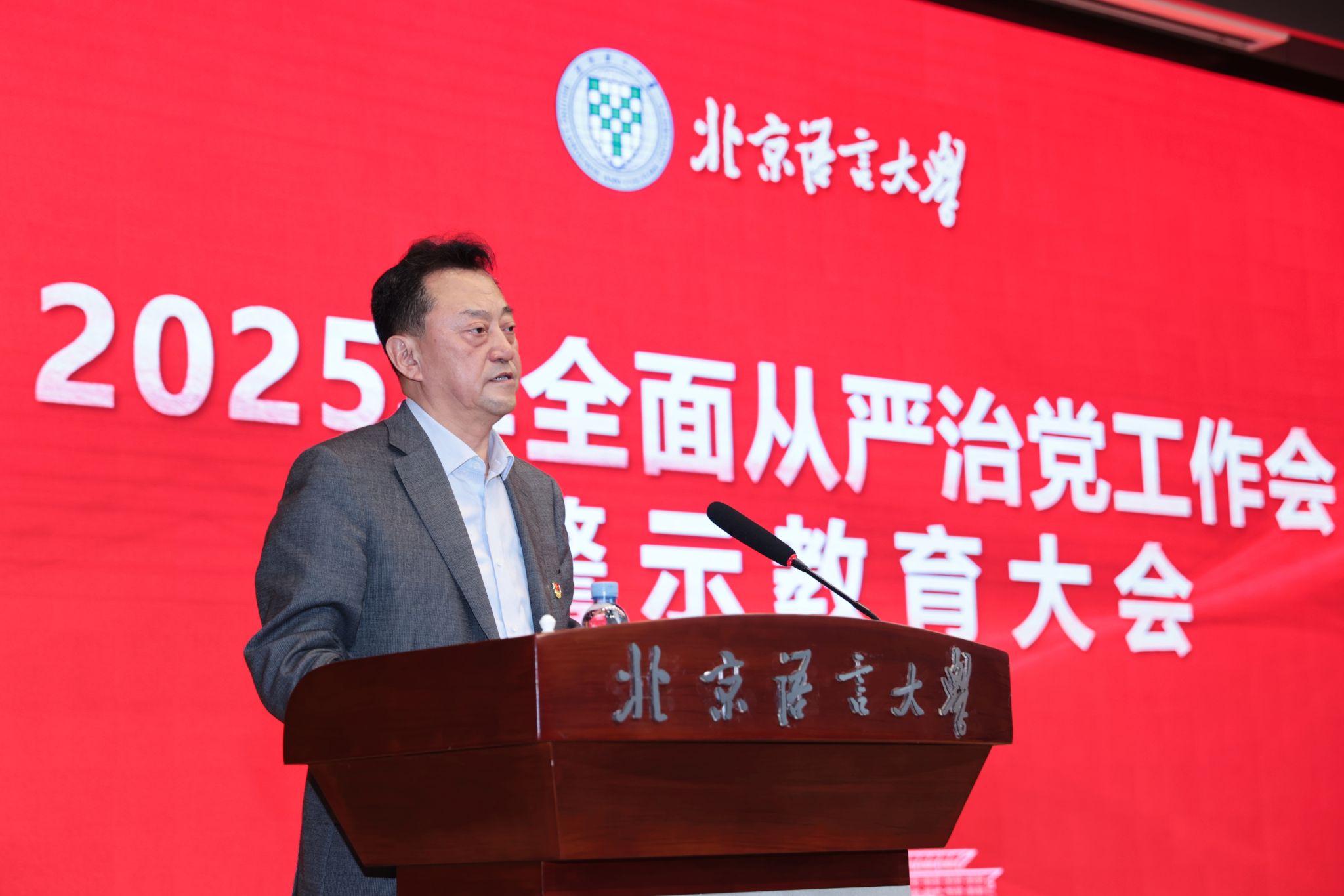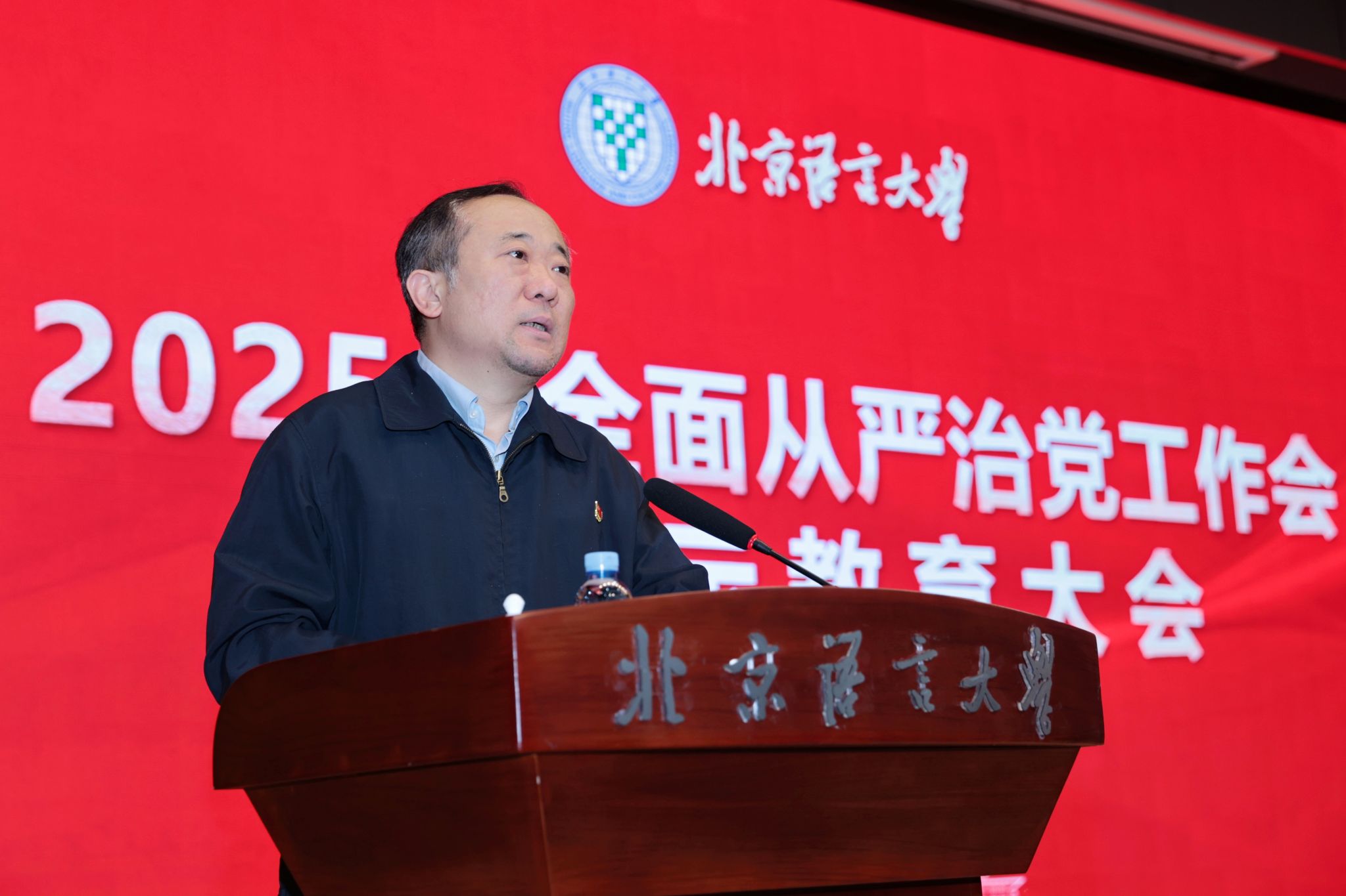 北语新闻网4月18日电(通讯员 付夏婕 摄影 魏达)4月18日,学校召开2025年全面从严治党工作会暨警示教育大会,传达学习中央、教育部和北京市有关会议精神,通报有关违法违纪案例,开展警示教育,回顾总结2024年全面从严治党工作,对2025年重点工作进行部署。