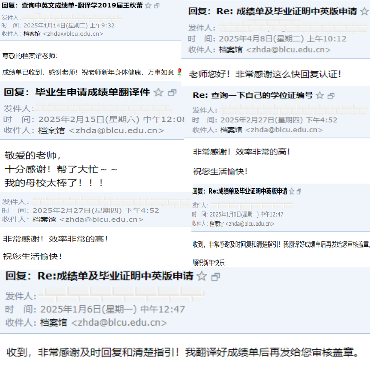 档案馆坚持“为师生办实事”的理念,系统总结馆内开展毕业生学历学位与成绩单认证服务十年来的工作,持续巩固认证工作中形成的规范管理程序和务实作风,进一步提高档案服务效能。认证工作始终坚持服务师生为本,不断精简规范认证流程,通过线上线下“全年候”服务模式,实现“一站式”即时办理、咨询邮件即时答复、快递即时寄送等。同时通过数字赋能,创新开展认证工作。本着“厉行节约、注重实效”的原则,持续推进档案管理信息化。馆藏高考录取名册、学籍档案、中英文成绩单、学位答辩材料等涉及认证的相关档案已全部实现数字化,已构建起“远程+线下”立体服务网,实现电子档案副本实时在线调阅,有效降低实体档案调用频率与纸本复制消耗。同时,为全面采集学历学位证书的完整数据,保证认证核验工作的及时准确,档案馆从2019年起将毕业生学历学位证书集中数字化扫描纳入年度归档工作,并持续至今,这为认证核验带来便利的同时,也为遗失证书的校友补办相关材料提供了重要参考,进一步丰富了馆藏校友档案信息。便捷高效的服务切实解决了师生校友在求学、求职、晋升、出国、移民等方面的急难需求,赢得广泛好评。