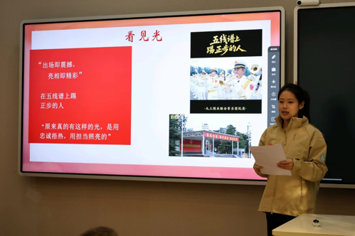 随后,李子文、王韵迪、刘诗月、林昱晔、吴其璇、王振泽六位同学依次分享交流。李子文以《当我的青春,汇入时代的和声》为题,结合合唱与阅兵经历,阐述青春融入时代的深刻感悟;王韵迪在《接过那束光》中,分享了从忠诚与担当之光中汲取的奋进力量;刘诗月通过《历史,从未如此贴近》,讲述追寻家族抗战历史、守护民族记忆的心路;林昱晔在《这个夏天,我看见的三束光》中,诠释了学校、同伴与历史共谱的时代和声;吴其璇以《天空与大地教会我的事》,分享了志愿服务中领悟的信念重量与平凡坚守的价值;王振泽则在《那次,我把自己“调岗”了八十米》中,讲述了从“见证者”到“守护者”的成长蜕变.